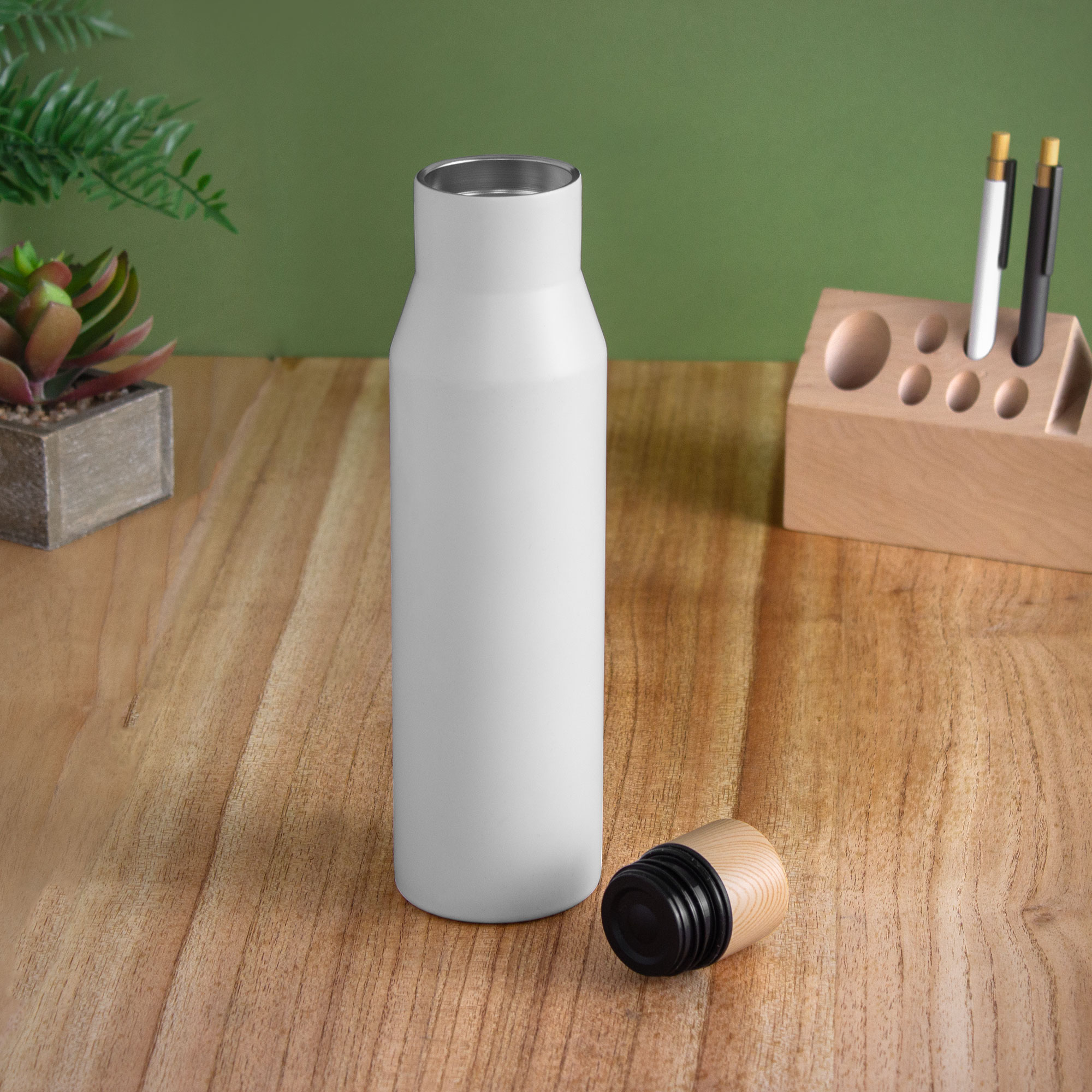 Botella doble pared, sellada al vacío. Interior de acero 304 y exterior de acero 201. Pintura acabado mate. Tapa a rosca con anillo de silicona, interior de acero 201 y exterior en polipropileno imitación bambú. Mantiene por más de 12 hs la temperatura de las bebidas calientes y 24 hs de las bebidas frías.