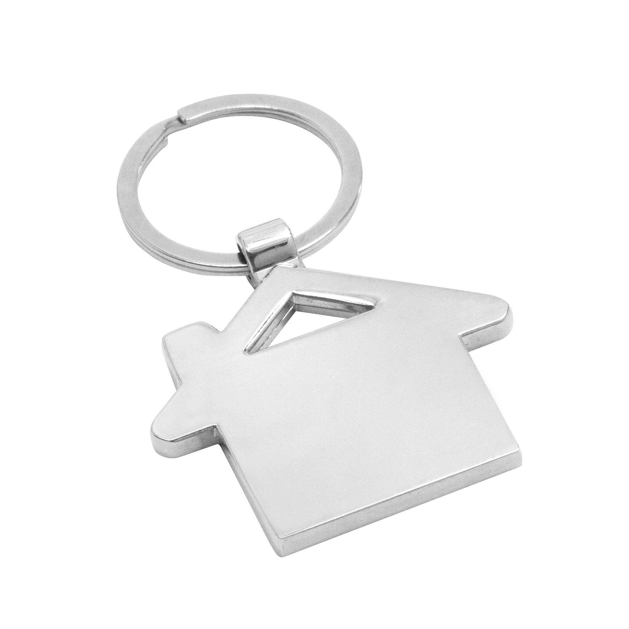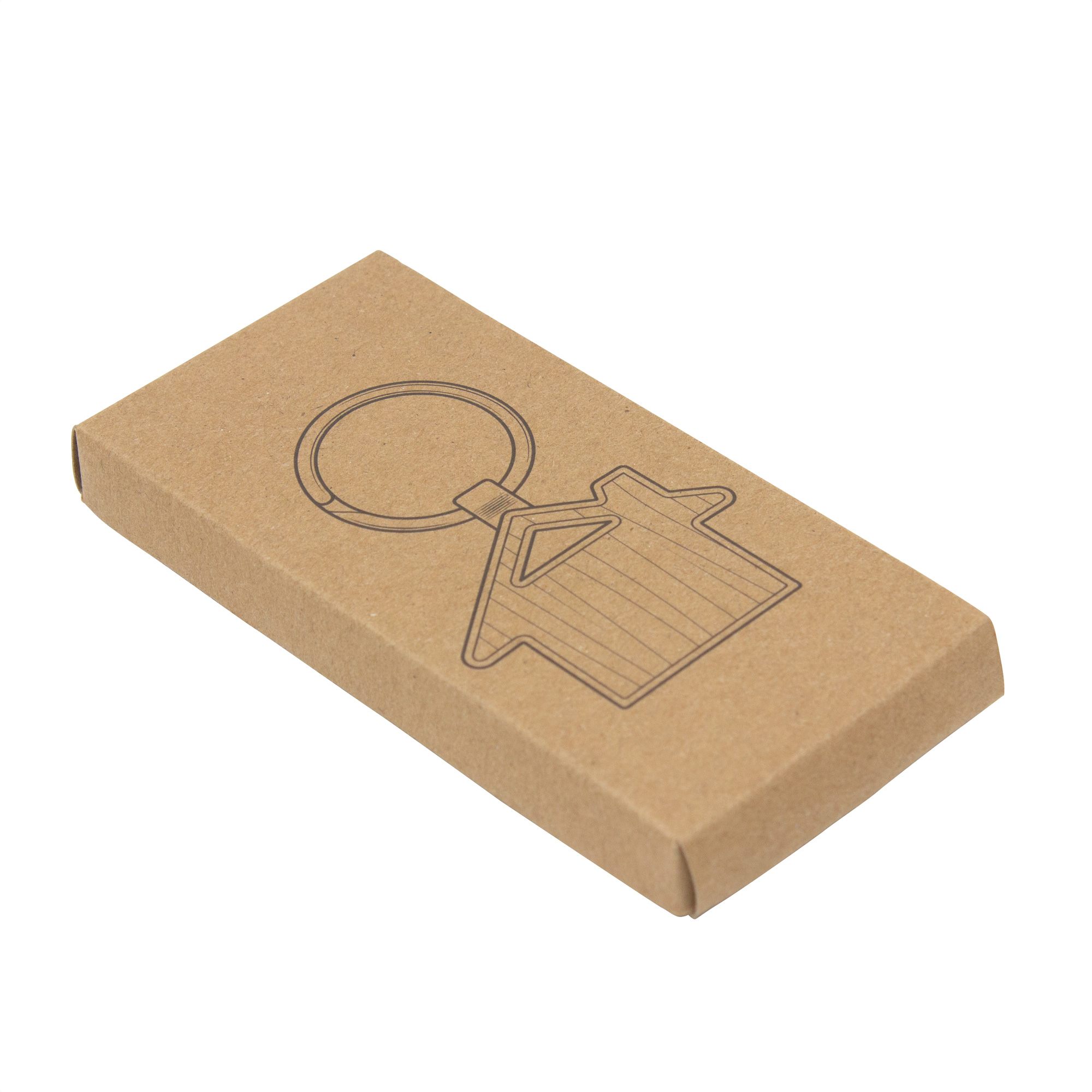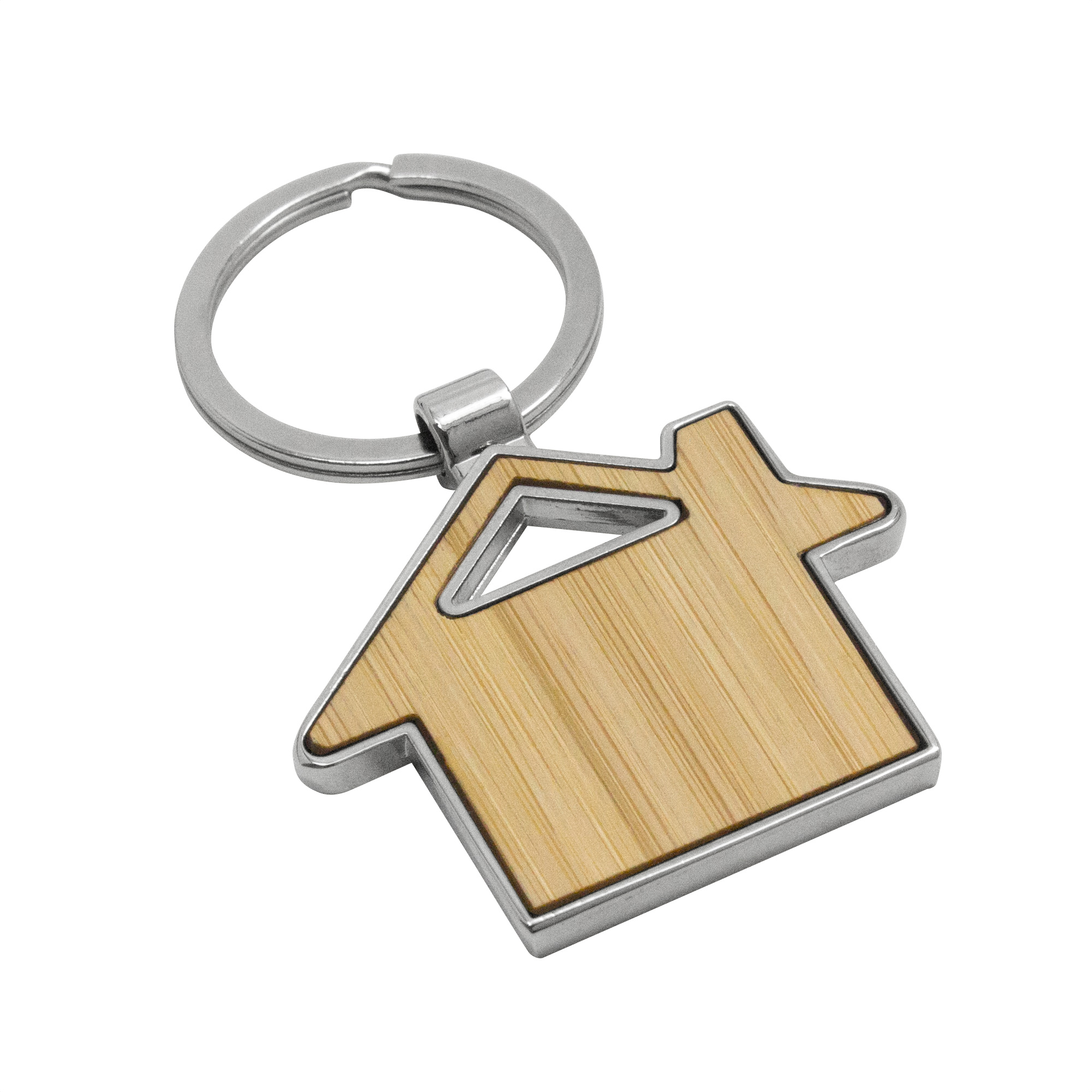 Llavero con forma de casa. Estructura metálica con aleación de zinc con acabado brillante y panel frontal de bambú barnizado.