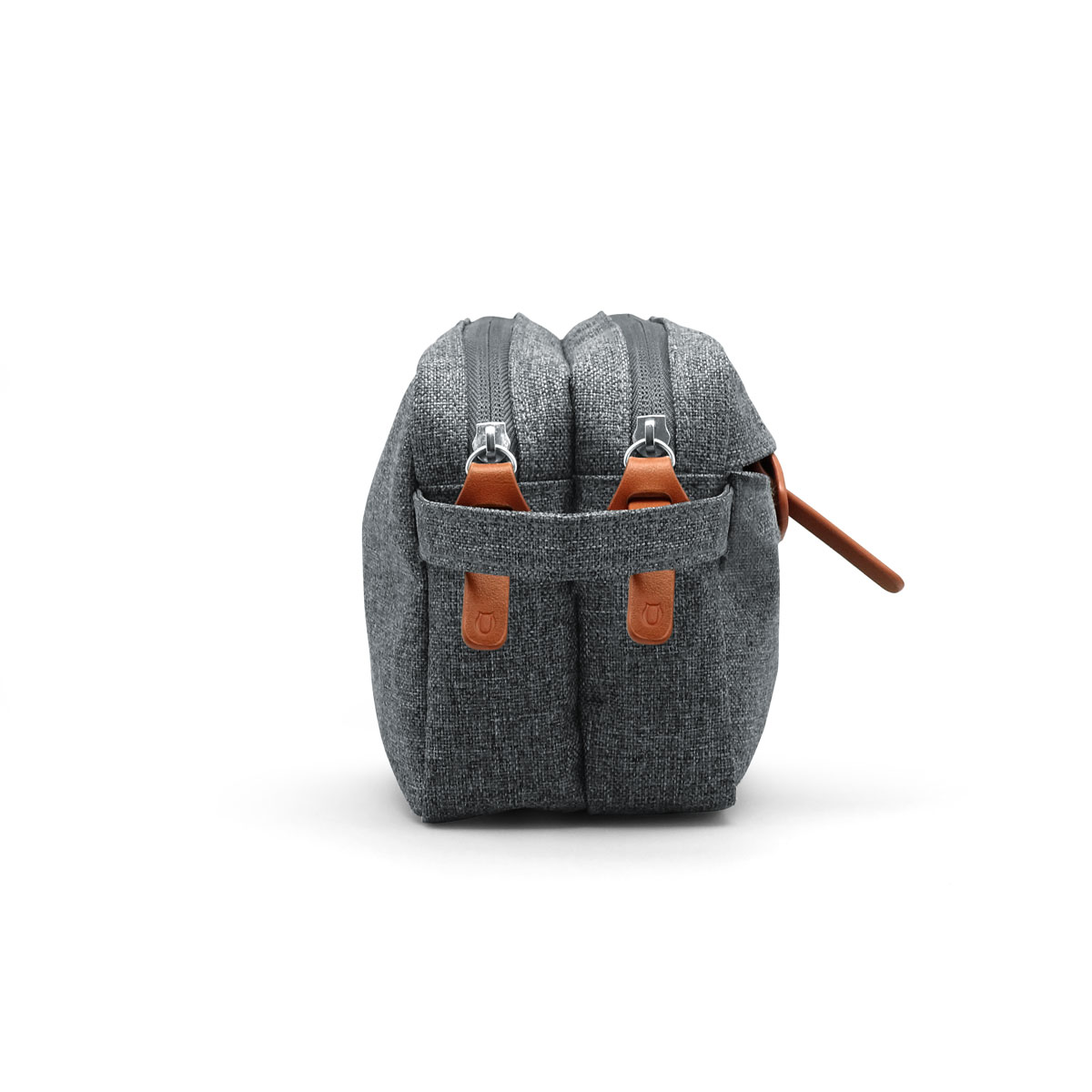 21,5 x 13,1 x 8 cm.U KIT. Poliéster, Nylon y Cuero ecológico. Necessaire. Organizador con dos compartimentos individuales forrados en el interior, un bolsillo delantero y correa para transportar.