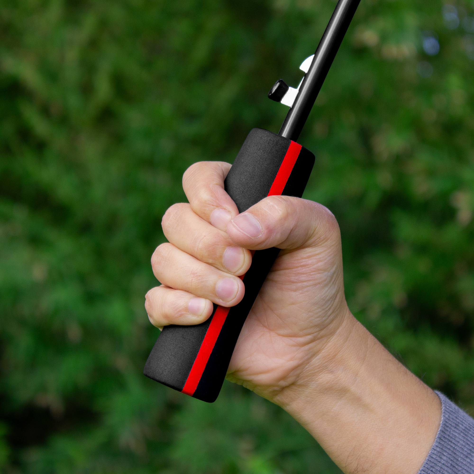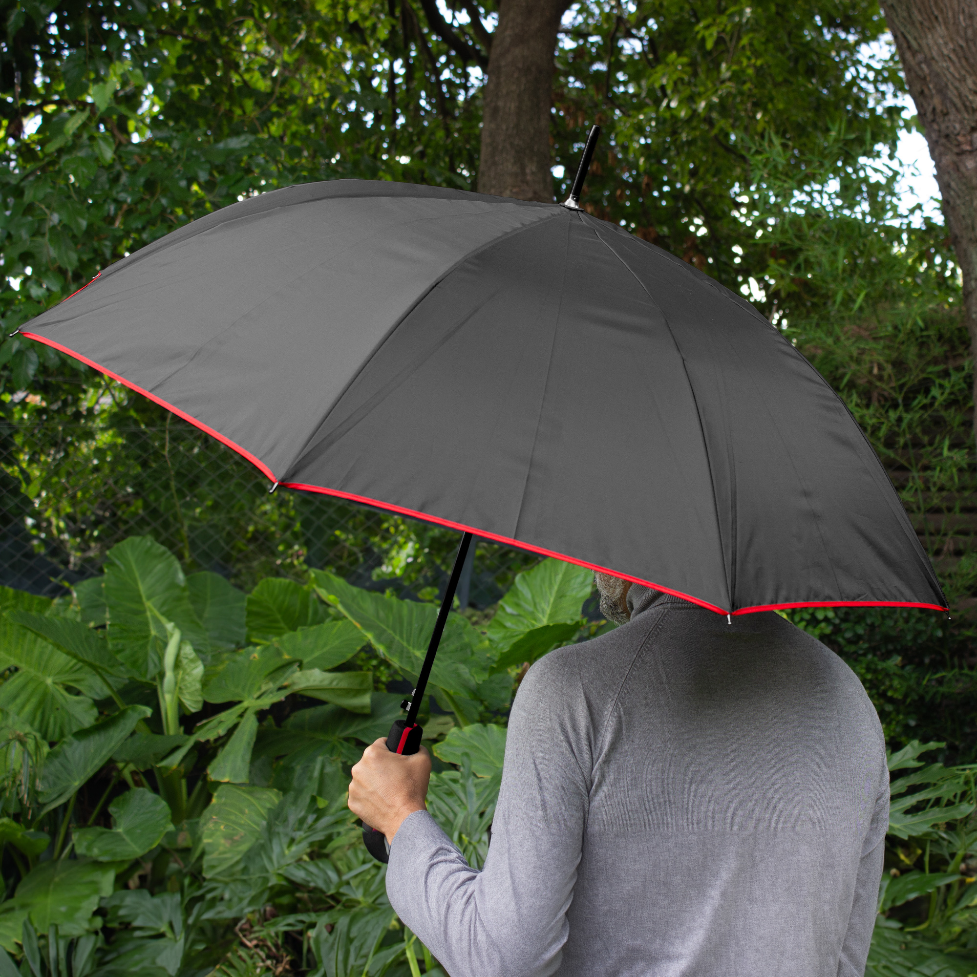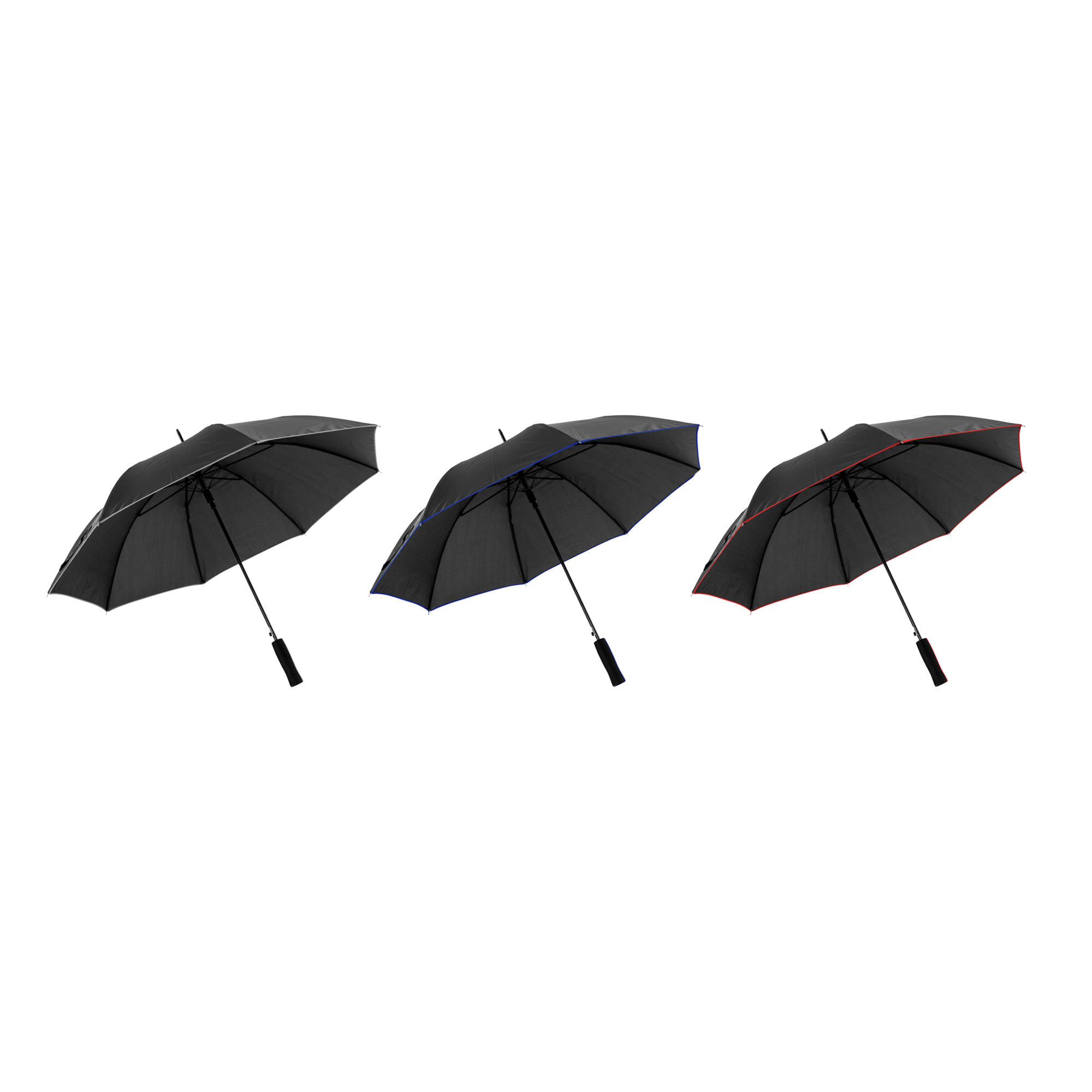 Paraguas APERTURA AUTOMÁTICA Y CIERRE MANUAL. Eje y varillas metálicas. Mango de goma eva de doble color. Botón a presión. Cubierta y funda de poliéster. Cierre con correa de velcro.